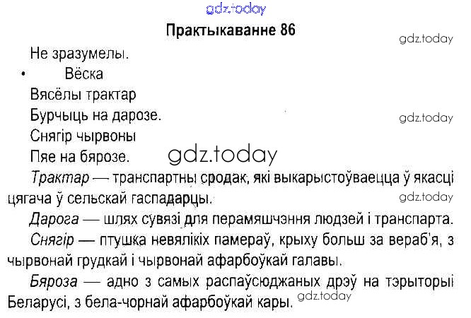 На страницах сайта gdz.today вы найдете учебный и вспомогательный материал, направленный на улучшения знаний школьной программы. ГДЗ - онлайн мир знаний Рашальнік да часткі 2. Практыкаванні 86 Учебнику по Белорусскому языку для 5 класса Красней, Несцяровіч Национальный институт образования 2014