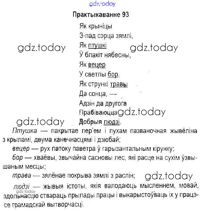На страницах сайта gdz.today вы найдете учебный и вспомогательный материал, направленный на улучшения знаний школьной программы. ГДЗ - онлайн мир знаний Рашальнік да часткі 2. Практыкаванні 93 Учебнику по Белорусскому языку для 5 класса Красней, Несцяровіч Национальный институт образования 2014