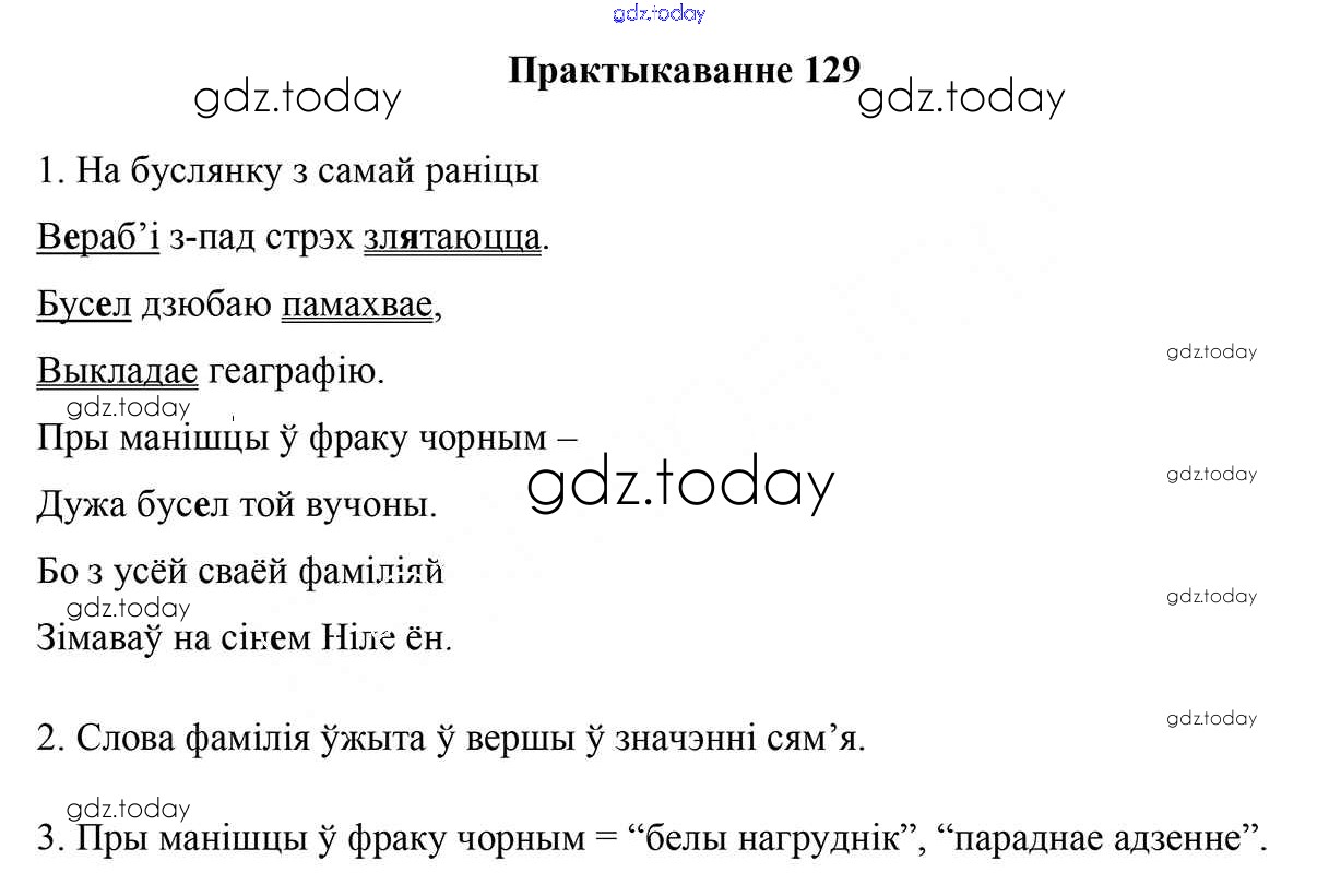 На страницах сайта gdz.today вы найдете учебный и вспомогательный материал, направленный на улучшения знаний школьной программы. ГДЗ - онлайн мир знаний Рашальнік да часткі 1. Практыкаванні 129 Учебнику по Белорусскому языку для 5 класса Валочка, Зелянко Национальный институт образования 2019