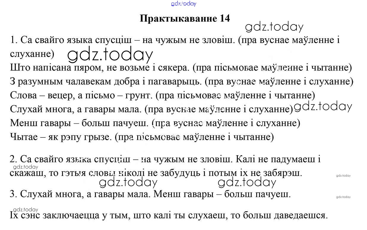 На страницах сайта gdz.today вы найдете учебный и вспомогательный материал, направленный на улучшения знаний школьной программы. ГДЗ - онлайн мир знаний Рашальнік да часткі 1. Практыкаванні 14 Учебнику по Белорусскому языку для 5 класса Валочка, Зелянко Национальный институт образования 2019