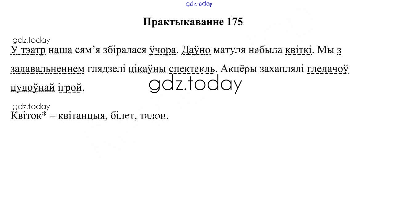 На страницах сайта gdz.today вы найдете учебный и вспомогательный материал, направленный на улучшения знаний школьной программы. ГДЗ - онлайн мир знаний Рашальнік да часткі 1. Практыкаванні 175 Учебнику по Белорусскому языку для 5 класса Валочка, Зелянко Национальный институт образования 2019