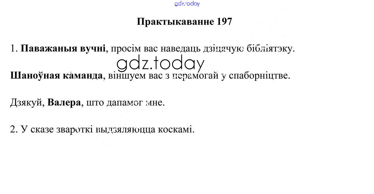 На страницах сайта gdz.today вы найдете учебный и вспомогательный материал, направленный на улучшения знаний школьной программы. ГДЗ - онлайн мир знаний Рашальнік да часткі 1. Практыкаванні 197 Учебнику по Белорусскому языку для 5 класса Валочка, Зелянко Национальный институт образования 2019