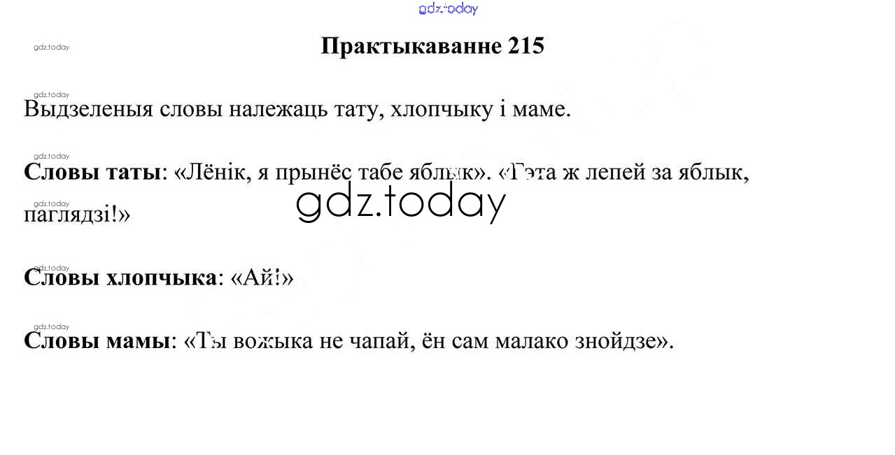 На страницах сайта gdz.today вы найдете учебный и вспомогательный материал, направленный на улучшения знаний школьной программы. ГДЗ - онлайн мир знаний Рашальнік да часткі 1. Практыкаванні 215 Учебнику по Белорусскому языку для 5 класса Валочка, Зелянко Национальный институт образования 2019