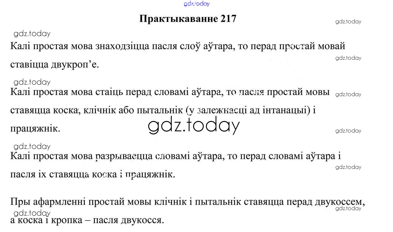 На страницах сайта gdz.today вы найдете учебный и вспомогательный материал, направленный на улучшения знаний школьной программы. ГДЗ - онлайн мир знаний Рашальнік да часткі 1. Практыкаванні 217 Учебнику по Белорусскому языку для 5 класса Валочка, Зелянко Национальный институт образования 2019