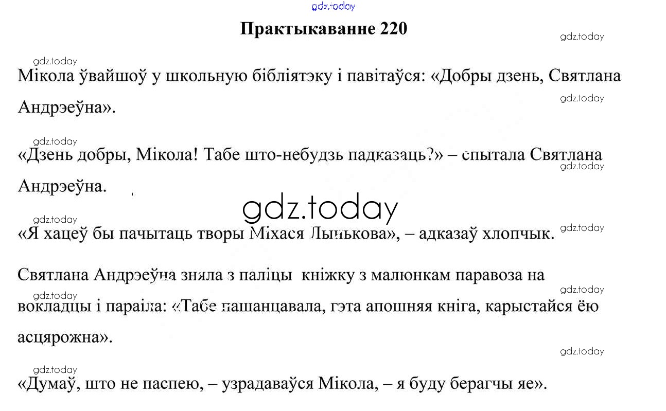 На страницах сайта gdz.today вы найдете учебный и вспомогательный материал, направленный на улучшения знаний школьной программы. ГДЗ - онлайн мир знаний Рашальнік да часткі 1. Практыкаванні 220 Учебнику по Белорусскому языку для 5 класса Валочка, Зелянко Национальный институт образования 2019