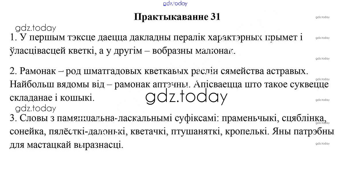 На страницах сайта gdz.today вы найдете учебный и вспомогательный материал, направленный на улучшения знаний школьной программы. ГДЗ - онлайн мир знаний Рашальнік да часткі 1. Практыкаванні 31 Учебнику по Белорусскому языку для 5 класса Валочка, Зелянко Национальный институт образования 2019