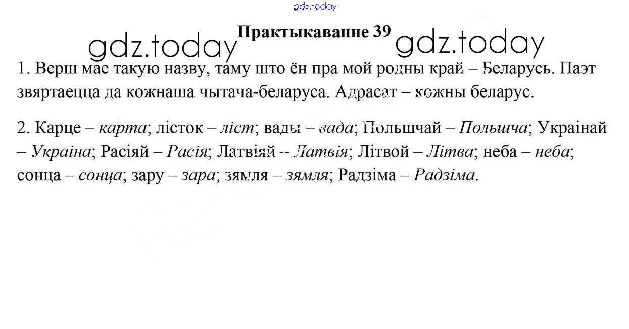 На страницах сайта gdz.today вы найдете учебный и вспомогательный материал, направленный на улучшения знаний школьной программы. ГДЗ - онлайн мир знаний Рашальнік да часткі 1. Практыкаванні 39 Учебнику по Белорусскому языку для 5 класса Валочка, Зелянко Национальный институт образования 2019