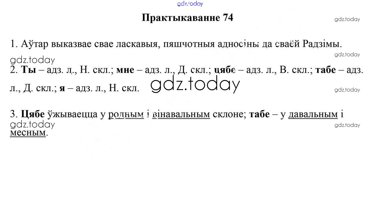 На страницах сайта gdz.today вы найдете учебный и вспомогательный материал, направленный на улучшения знаний школьной программы. ГДЗ - онлайн мир знаний Рашальнік да часткі 1. Практыкаванні 74 Учебнику по Белорусскому языку для 5 класса Валочка, Зелянко Национальный институт образования 2019