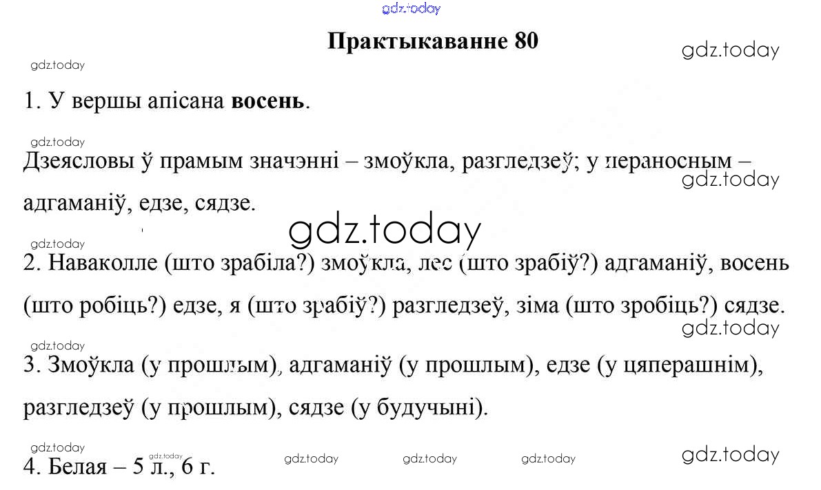 На страницах сайта gdz.today вы найдете учебный и вспомогательный материал, направленный на улучшения знаний школьной программы. ГДЗ - онлайн мир знаний Рашальнік да часткі 1. Практыкаванні 80 Учебнику по Белорусскому языку для 5 класса Валочка, Зелянко Национальный институт образования 2019
