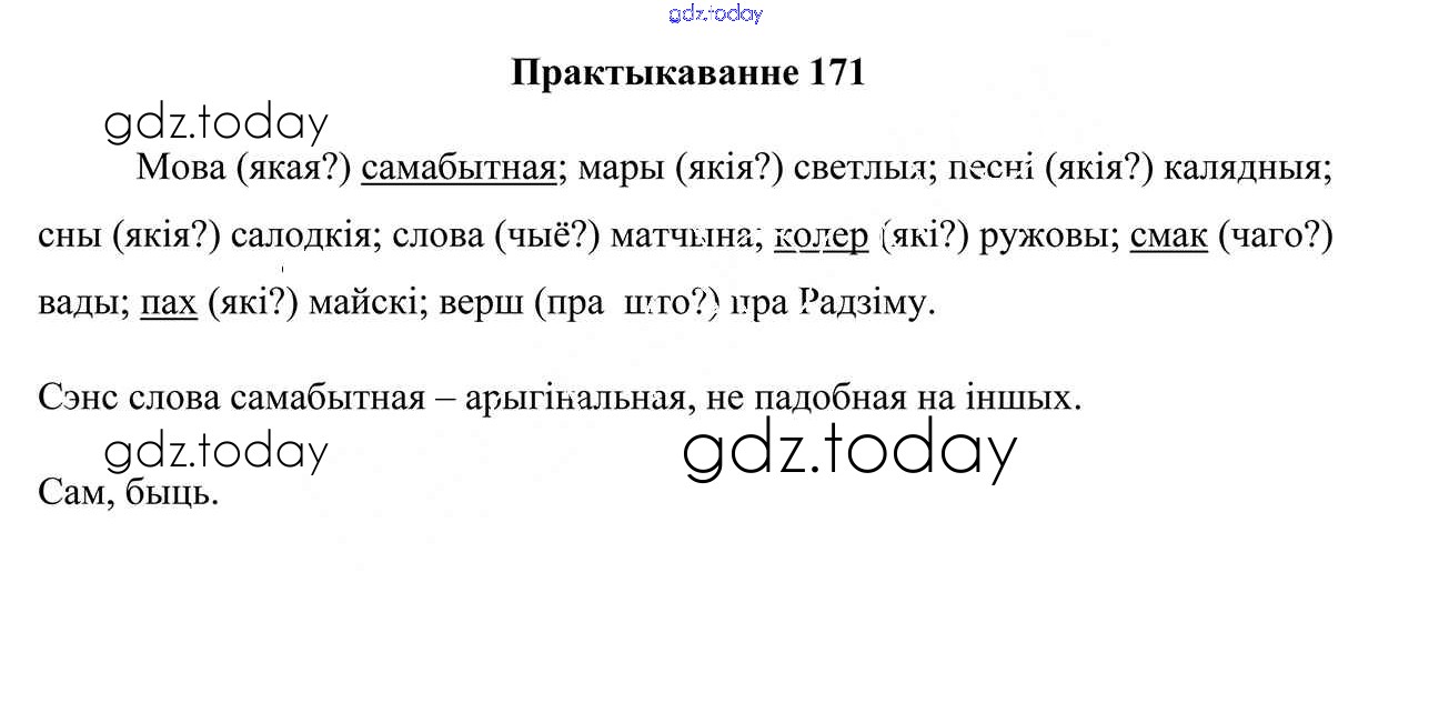 На страницах сайта gdz.today вы найдете учебный и вспомогательный материал, направленный на улучшения знаний школьной программы. ГДЗ - онлайн мир знаний Рашальнік да часткі 2. Практыкаванні 171 Учебнику по Белорусскому языку для 5 класса Валочка, Зелянко Национальный институт образования 2019