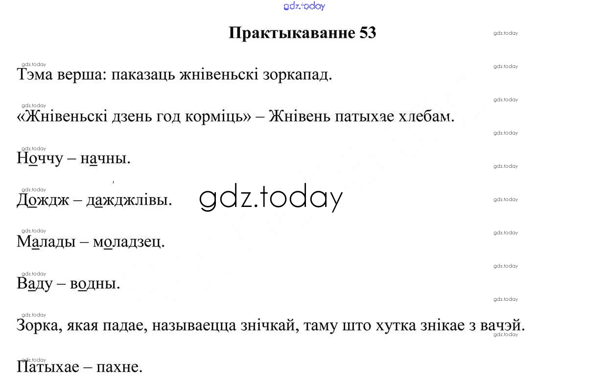 На страницах сайта gdz.today вы найдете учебный и вспомогательный материал, направленный на улучшения знаний школьной программы. ГДЗ - онлайн мир знаний Рашальнік да часткі 2. Практыкаванні 53 Учебнику по Белорусскому языку для 5 класса Валочка, Зелянко Национальный институт образования 2019
