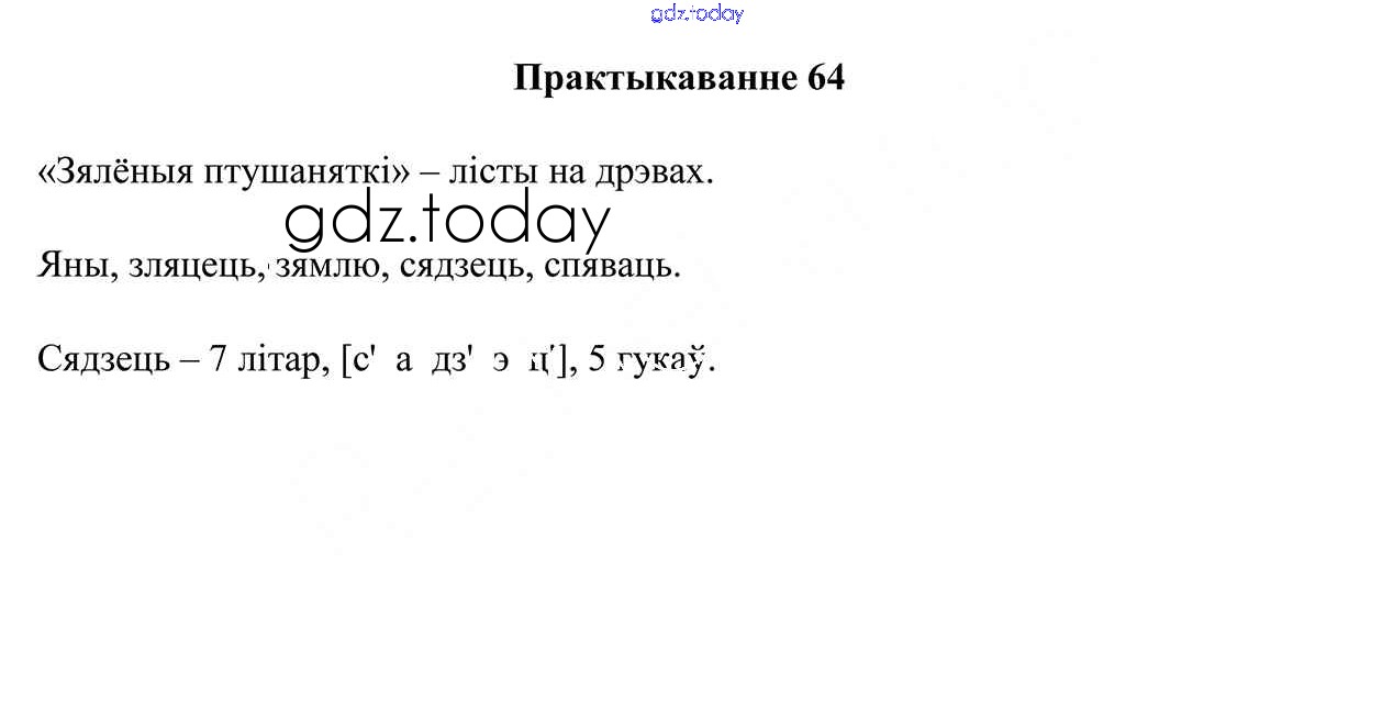 На страницах сайта gdz.today вы найдете учебный и вспомогательный материал, направленный на улучшения знаний школьной программы. ГДЗ - онлайн мир знаний Рашальнік да часткі 2. Практыкаванні 64 Учебнику по Белорусскому языку для 5 класса Валочка, Зелянко Национальный институт образования 2019