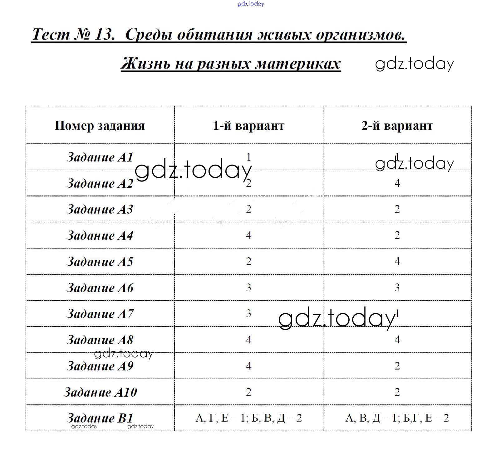 На страницах сайта gdz.today вы найдете учебный и вспомогательный материал, направленный на улучшения знаний школьной программы. ГДЗ - онлайн мир знаний Решение к тестам Тест №13. Среды обитания живых организмов. Жизнь на разных материках Контрольно-измерительным материалам (КИМ) по Биологии для 5 класса Богданов ВАКО 2017