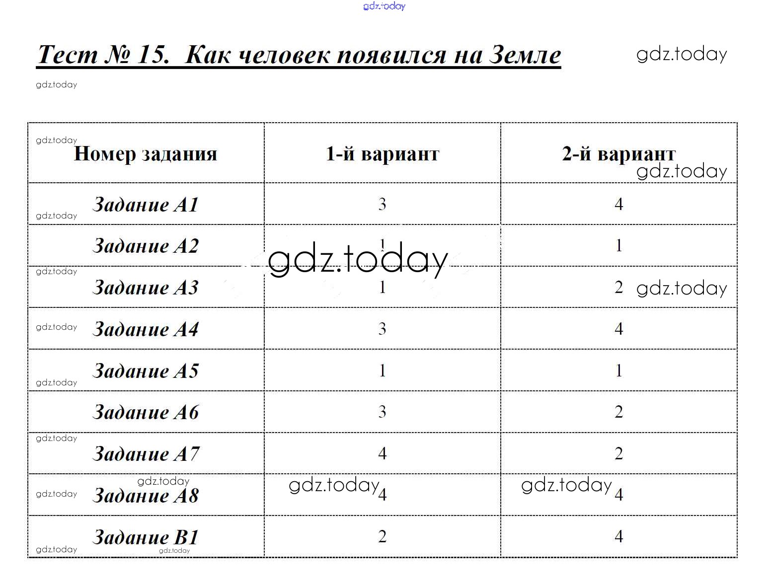 На страницах сайта gdz.today вы найдете учебный и вспомогательный материал, направленный на улучшения знаний школьной программы. ГДЗ - онлайн мир знаний Решение к тестам Тест №15. Как человек появился на Земле Контрольно-измерительным материалам (КИМ) по Биологии для 5 класса Богданов ВАКО 2017