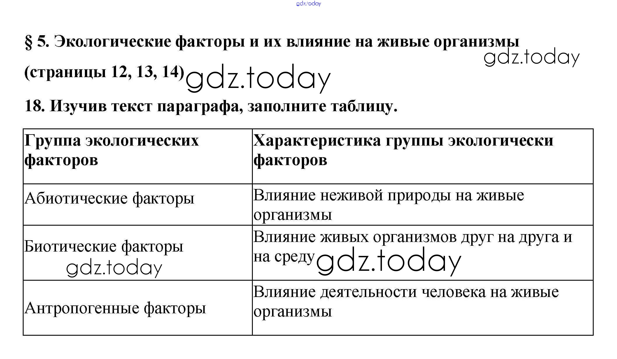 На страницах сайта gdz.today вы найдете учебный и вспомогательный материал, направленный на улучшения знаний школьной программы. ГДЗ - онлайн мир знаний Решение к § 5. Экологические факторы и их влияние на живые организмы стр. 12 Рабочей тетради по Биологии для 5 класса Пасечник Дрофа Вертикаль 2015