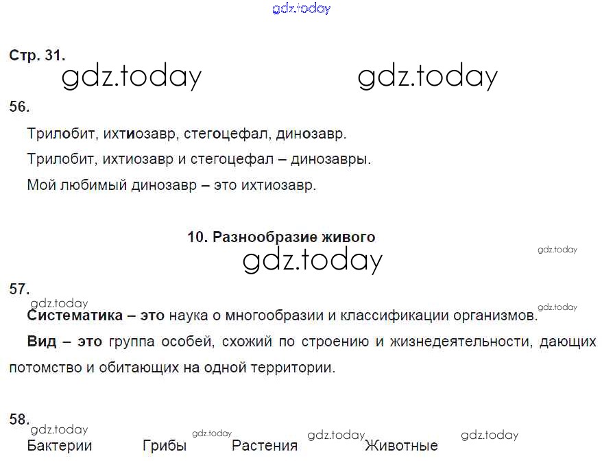 На страницах сайта gdz.today вы найдете учебный и вспомогательный материал, направленный на улучшения знаний школьной программы. ГДЗ - онлайн мир знаний Решение к части 2. Многообразие живых организмов (страницы) стр. 31 Рабочей тетради по Биологии для 5 класса Сонин Дрофа Вертикаль 2017