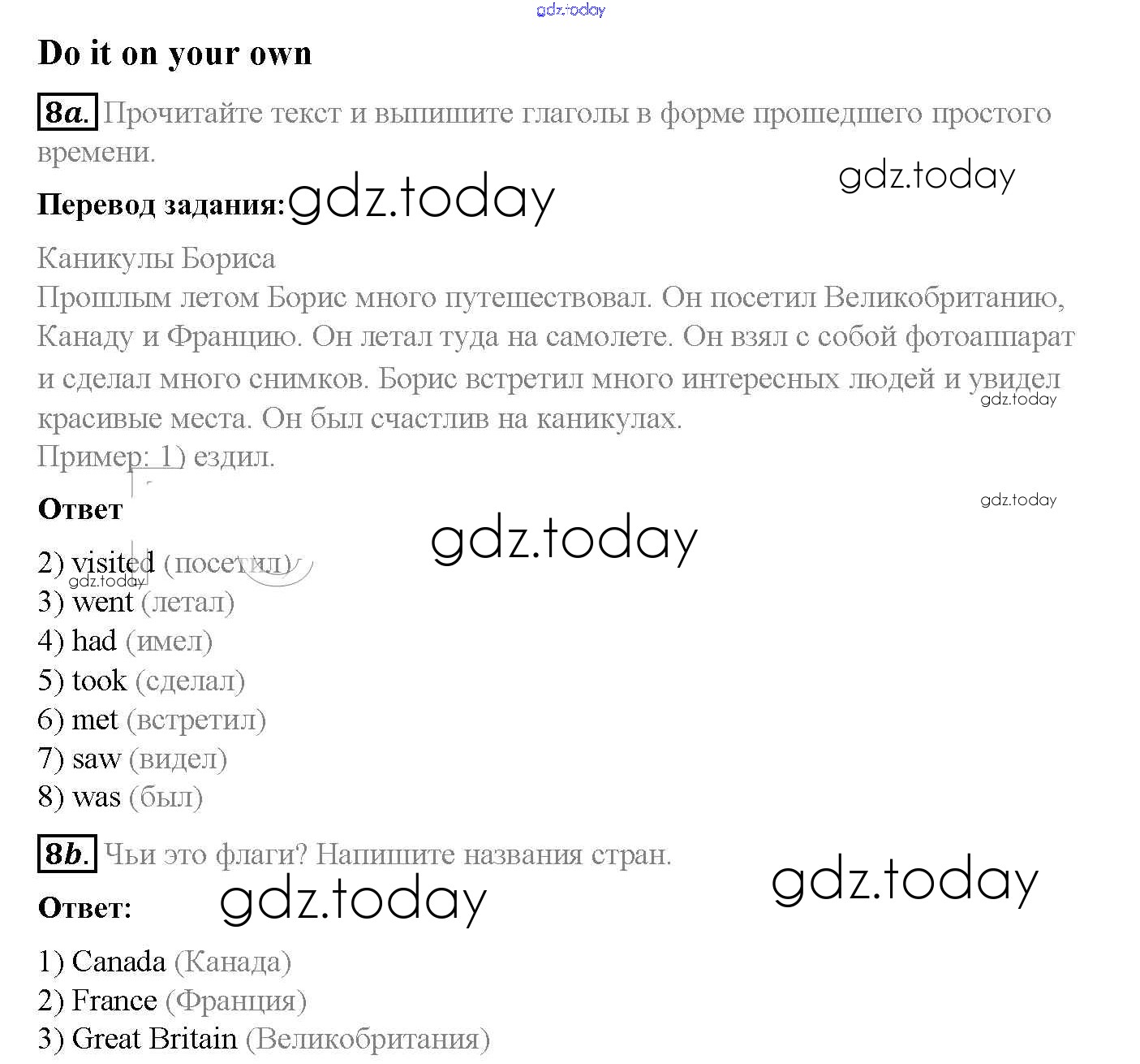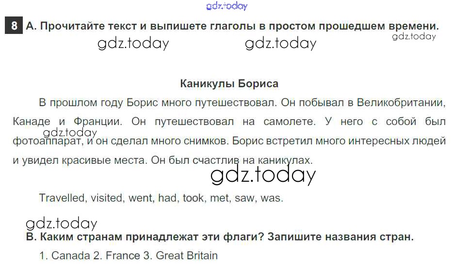 На страницах сайта gdz.today вы найдете учебный и вспомогательный материал, направленный на улучшения знаний школьной программы. ГДЗ - онлайн мир знаний Step 2 Решение к Unit 1. Holidays Are Over 8 Учебнику по Английскому языку для 5 класса Афанасьева, Михеева Дрофа Rainbow 2017