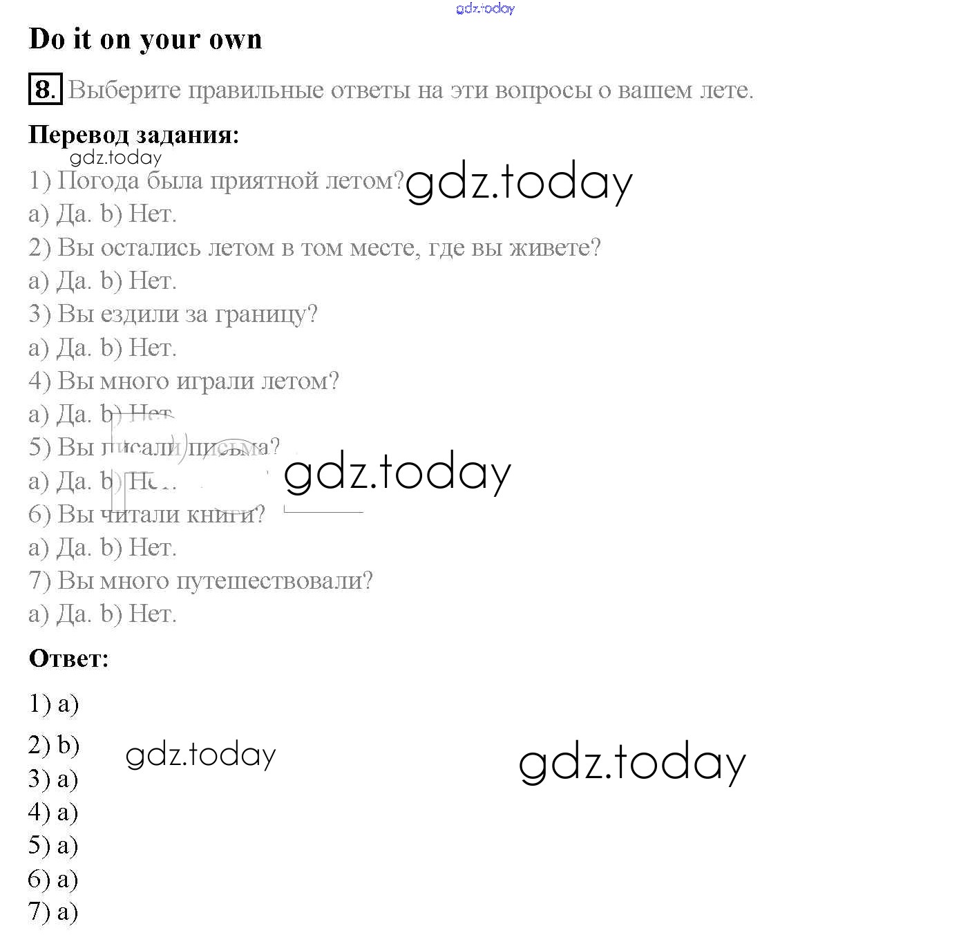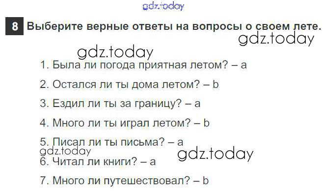 На страницах сайта gdz.today вы найдете учебный и вспомогательный материал, направленный на улучшения знаний школьной программы. ГДЗ - онлайн мир знаний Step 8. Round-up Решение к Unit 1. Holidays Are Over 8 Учебнику по Английскому языку для 5 класса Афанасьева, Михеева Дрофа Rainbow 2017