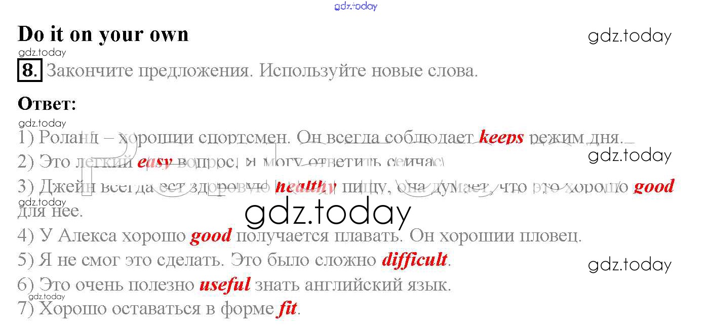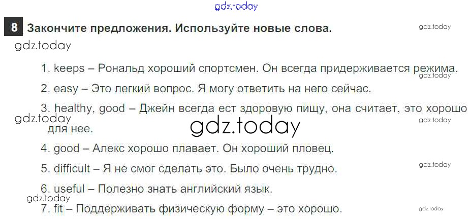 На страницах сайта gdz.today вы найдете учебный и вспомогательный материал, направленный на улучшения знаний школьной программы. ГДЗ - онлайн мир знаний Step 3 Решение к Unit 3. Healthy Ways 8 Учебнику по Английскому языку для 5 класса Афанасьева, Михеева Дрофа Rainbow 2017