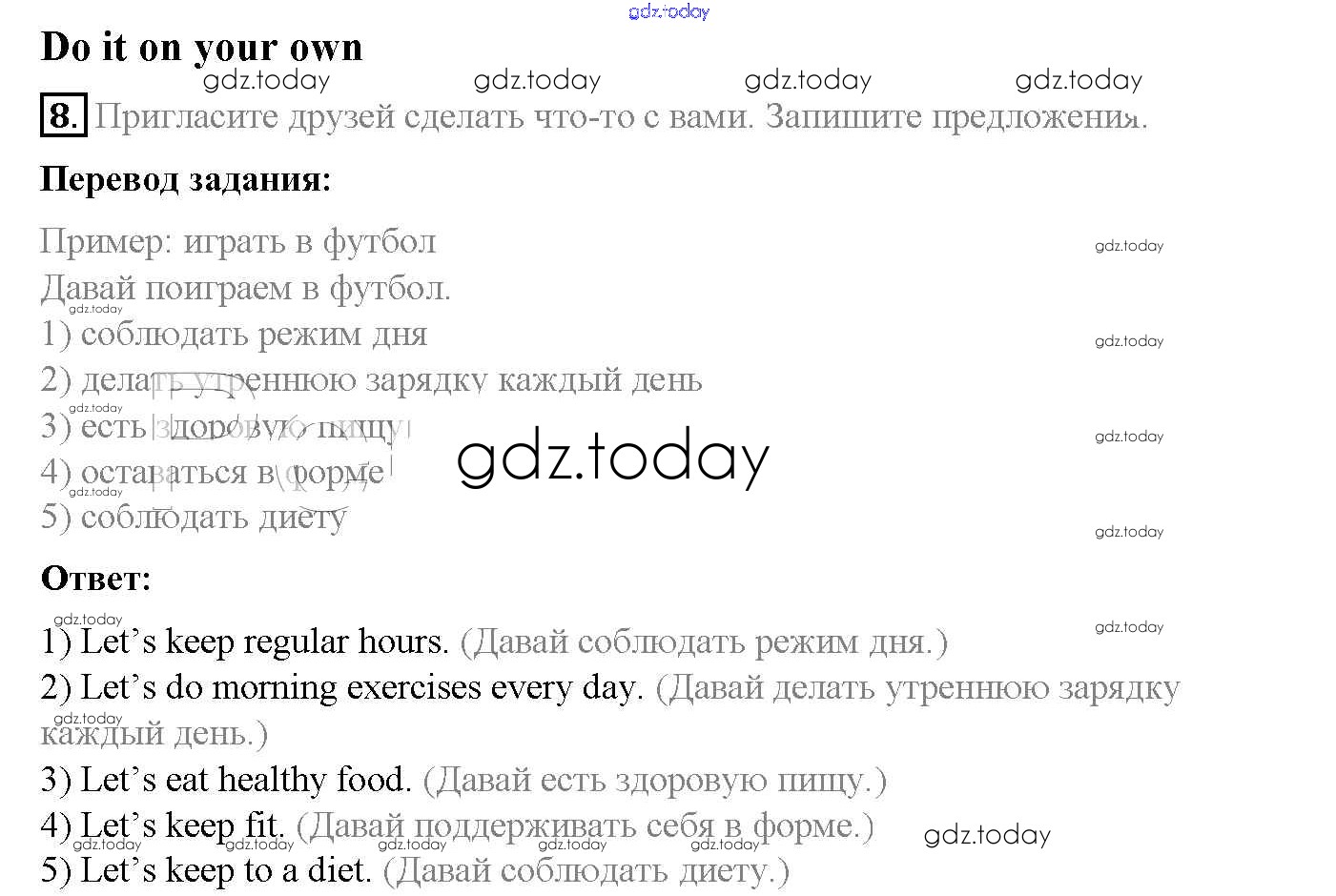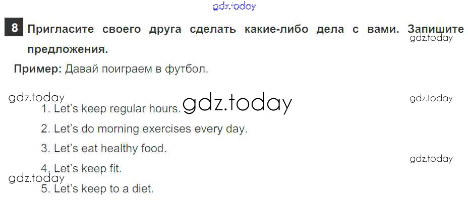 На страницах сайта gdz.today вы найдете учебный и вспомогательный материал, направленный на улучшения знаний школьной программы. ГДЗ - онлайн мир знаний Step 4 Решение к Unit 3. Healthy Ways 8 Учебнику по Английскому языку для 5 класса Афанасьева, Михеева Дрофа Rainbow 2017