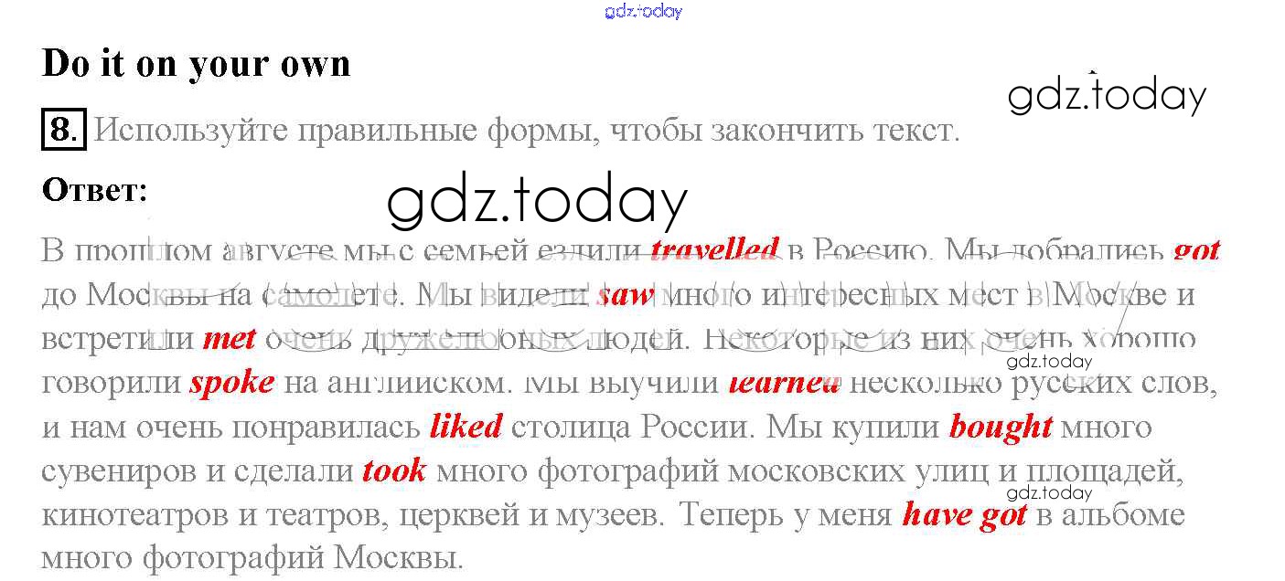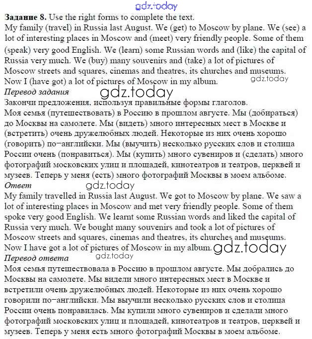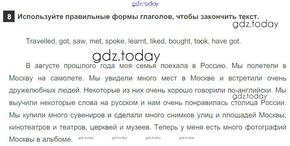 На страницах сайта gdz.today вы найдете учебный и вспомогательный материал, направленный на улучшения знаний школьной программы. ГДЗ - онлайн мир знаний Step 8. Round-up Решение к Unit 5. From Place to Place 8 Учебнику по Английскому языку для 5 класса Афанасьева, Михеева Дрофа Rainbow 2017