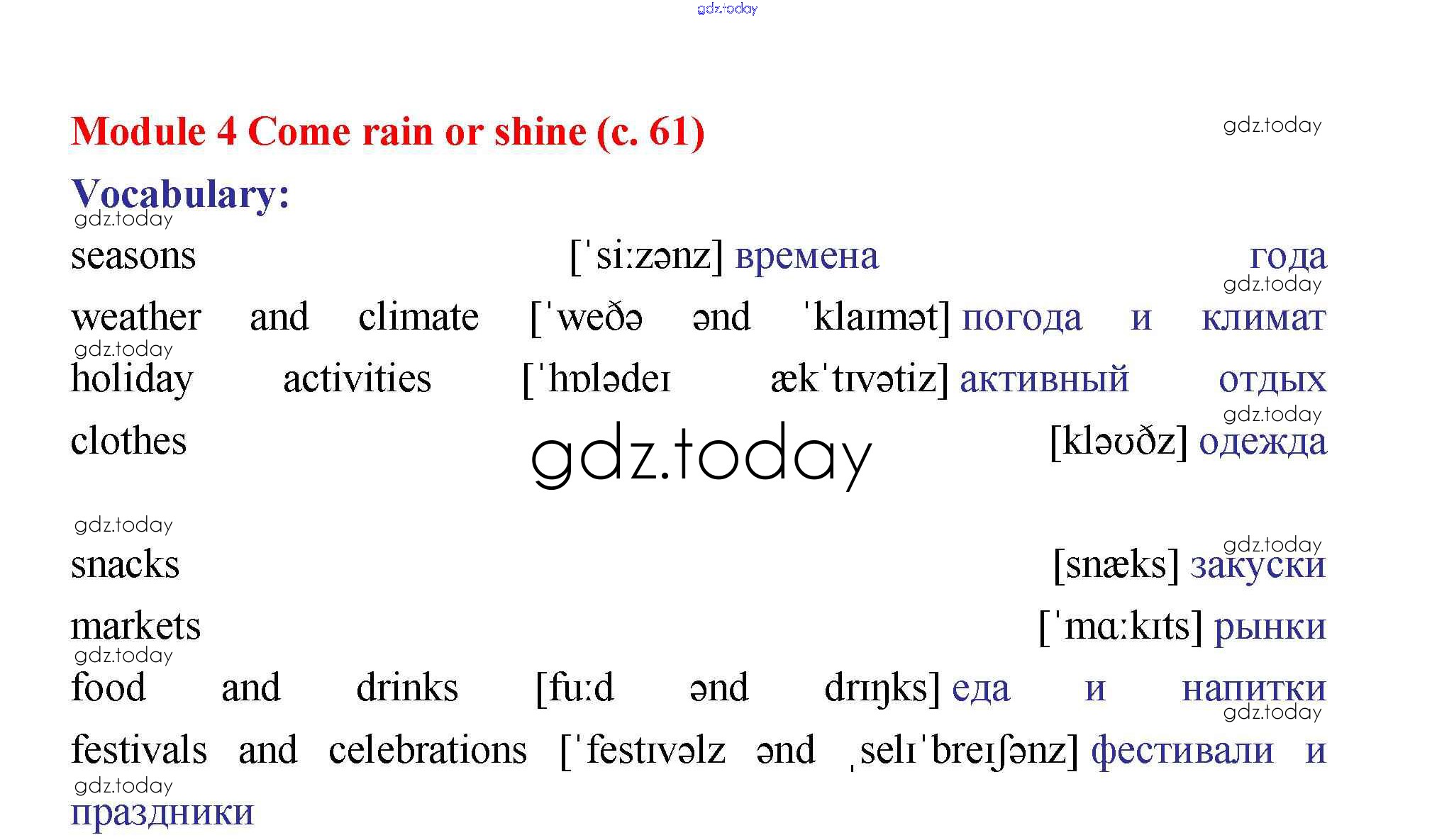 На страницах сайта gdz.today вы найдете учебный и вспомогательный материал, направленный на улучшения знаний школьной программы. ГДЗ - онлайн мир знаний Решение к Module 4. Come rain or shine стр.61 Учебнику по Английскому языку для 5 класса Баранова, Эванс Углубленный уровень Просвещение Starlight 2015