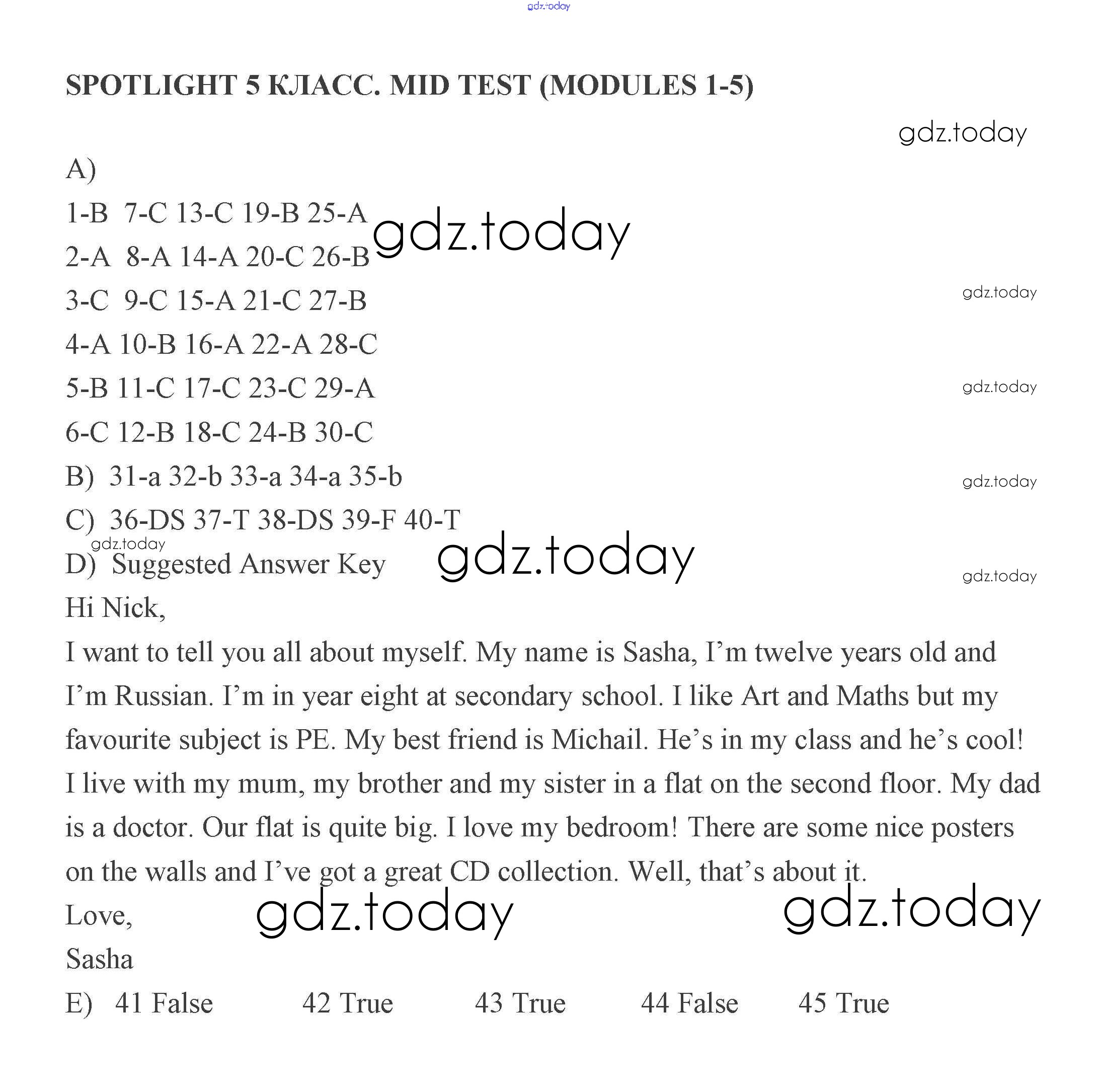 Ответы к Решение к итоговым тестам (Вариант) 1 Контрольным заданиям по Английскому языку для 5 класса Ваулина, Дули Просвещение Spotlight 2018