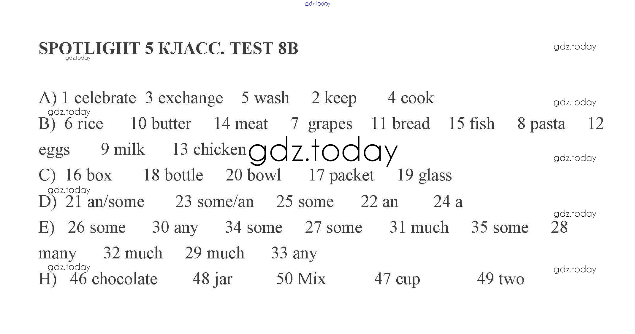 На страницах сайта gdz.today вы найдете учебный и вспомогательный материал, направленный на улучшения знаний школьной программы. ГДЗ - онлайн мир знаний Решение к тестам 8 (Варианты) 2 Контрольным заданиям по Английскому языку для 5 класса Ваулина, Дули Просвещение Spotlight 2018