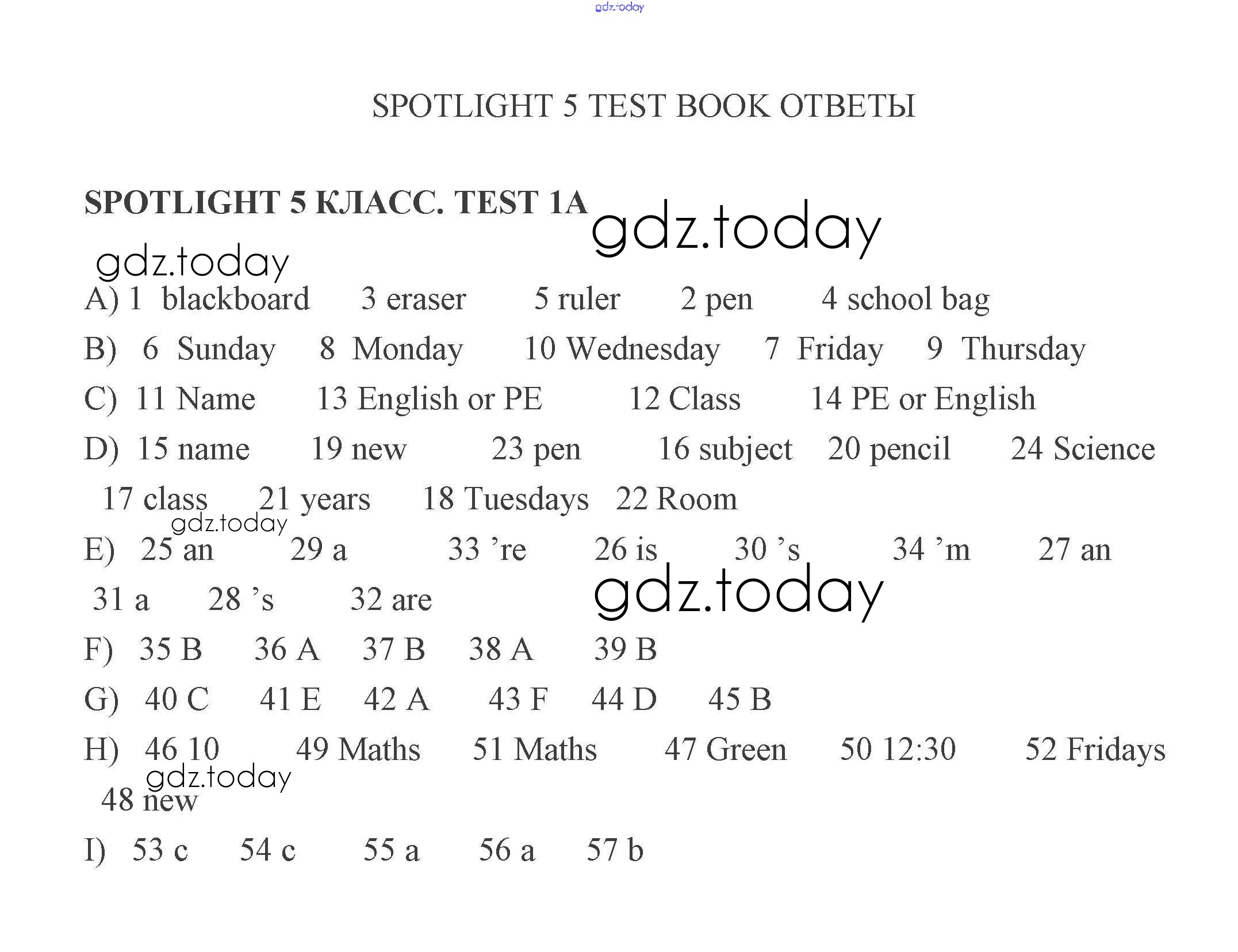 На страницах сайта gdz.today вы найдете учебный и вспомогательный материал, направленный на улучшения знаний школьной программы. ГДЗ - онлайн мир знаний Решение к тесту 1 A Контрольным заданиям по Английскому языку для 5 класса Ваулина, Дули Просвещение Spotlight 2008