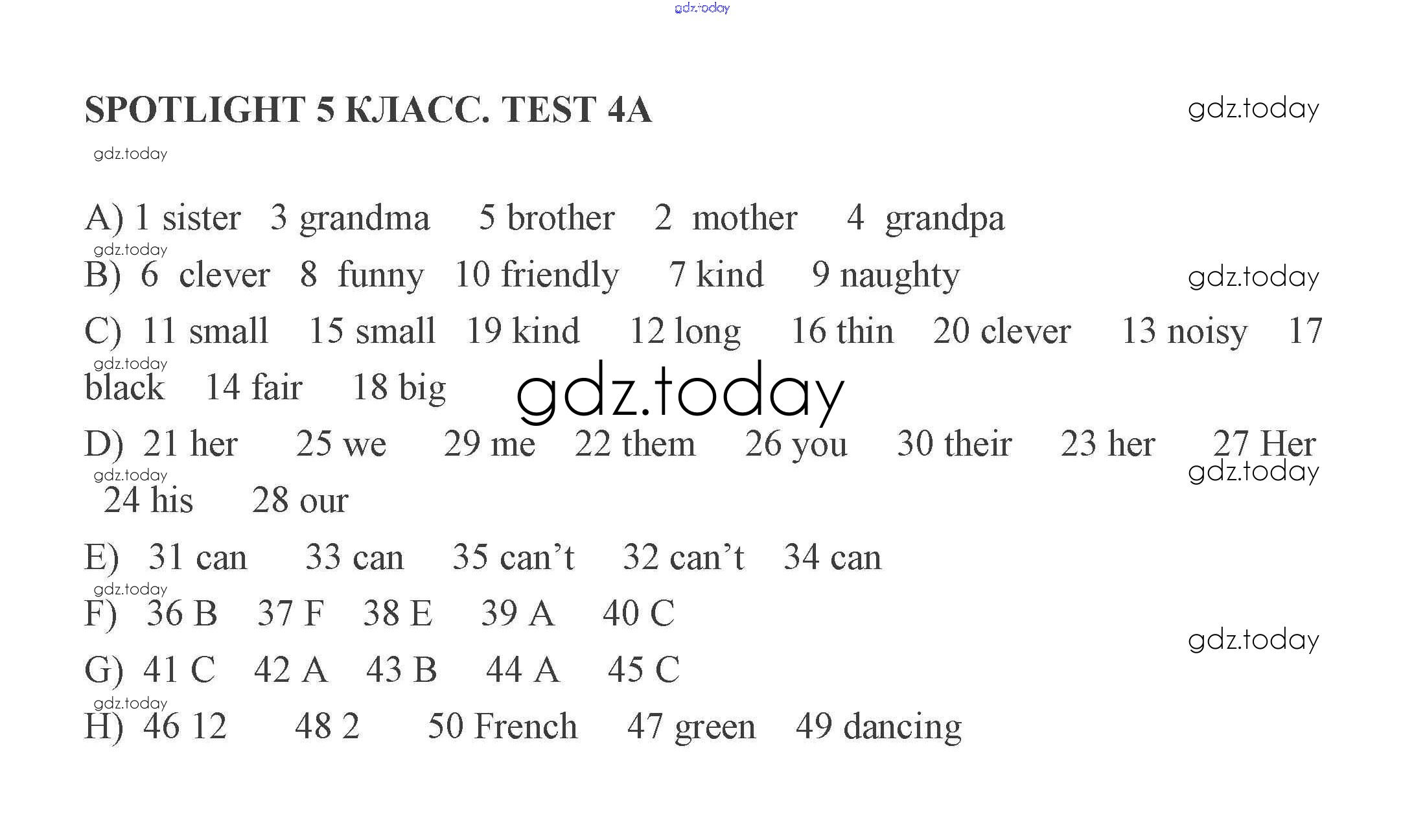 На страницах сайта gdz.today вы найдете учебный и вспомогательный материал, направленный на улучшения знаний школьной программы. ГДЗ - онлайн мир знаний Решение к тесту 4 A Контрольным заданиям по Английскому языку для 5 класса Ваулина, Дули Просвещение Spotlight 2008