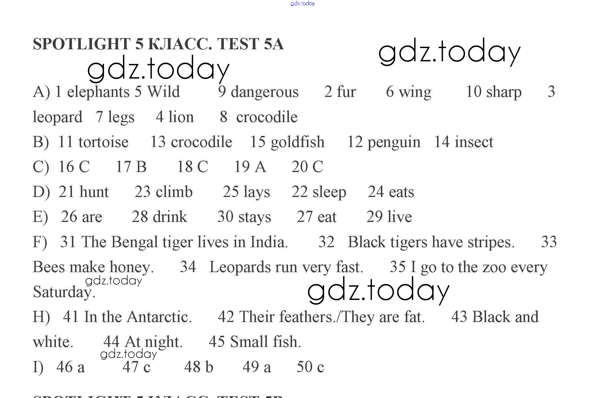 На страницах сайта gdz.today вы найдете учебный и вспомогательный материал, направленный на улучшения знаний школьной программы. ГДЗ - онлайн мир знаний Решение к тесту 5 A Контрольным заданиям по Английскому языку для 5 класса Ваулина, Дули Просвещение Spotlight 2008