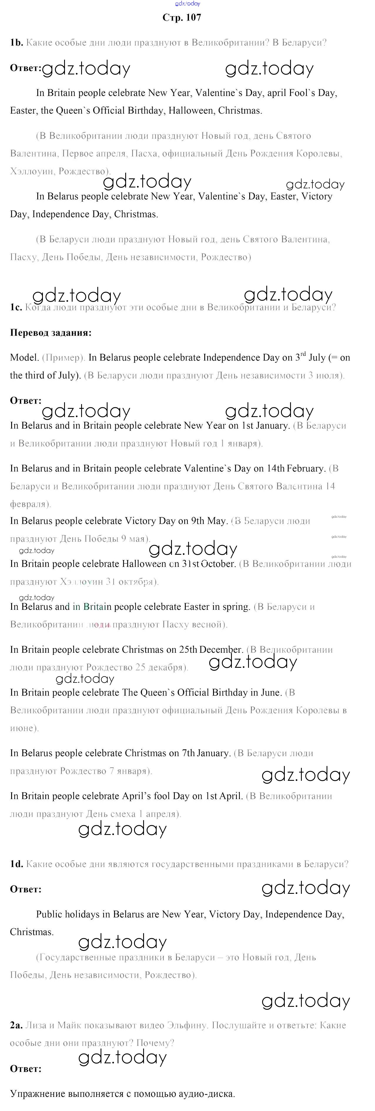 На страницах сайта gdz.today вы найдете учебный и вспомогательный материал, направленный на улучшения знаний школьной программы. ГДЗ - онлайн мир знаний Решение к части 1. Страницы 107 Учебнику по Английскому языку для 5 класса Лапицкая, Калишевич Народная асвета 2020