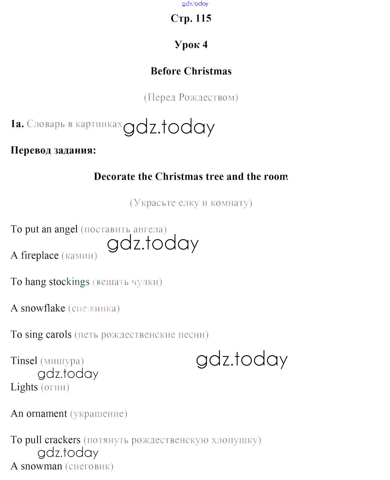На страницах сайта gdz.today вы найдете учебный и вспомогательный материал, направленный на улучшения знаний школьной программы. ГДЗ - онлайн мир знаний Решение к части 1. Страницы 115 Учебнику по Английскому языку для 5 класса Лапицкая, Калишевич Народная асвета 2020
