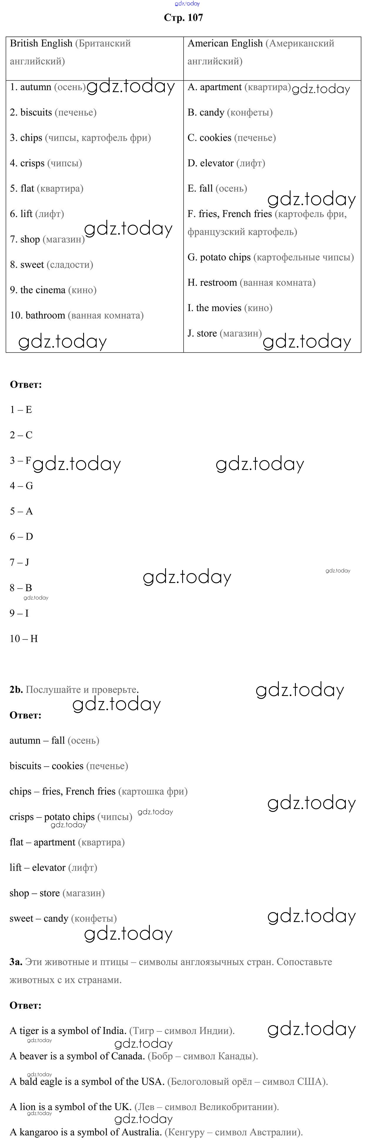 На страницах сайта gdz.today вы найдете учебный и вспомогательный материал, направленный на улучшения знаний школьной программы. ГДЗ - онлайн мир знаний Решение к части 2. Страницы 107 Учебнику по Английскому языку для 5 класса Лапицкая, Калишевич Народная асвета 2020
