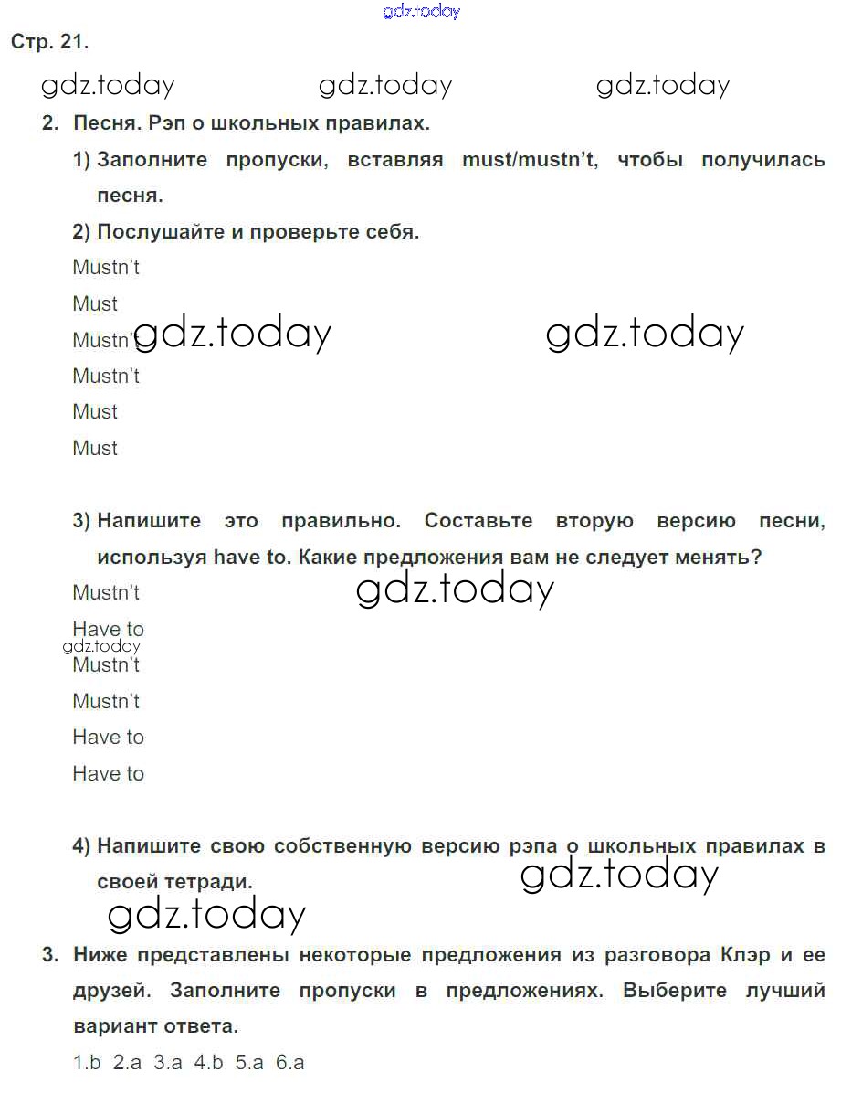 На страницах сайта gdz.today вы найдете учебный и вспомогательный материал, направленный на улучшения знаний школьной программы. ГДЗ - онлайн мир знаний Решение к Unit 2. Rules around us стр. 21 Рабочей тетради по Английскому языку для 5 класса Кузовлев, Лапа Просвещение Академический школьный учебник 2013