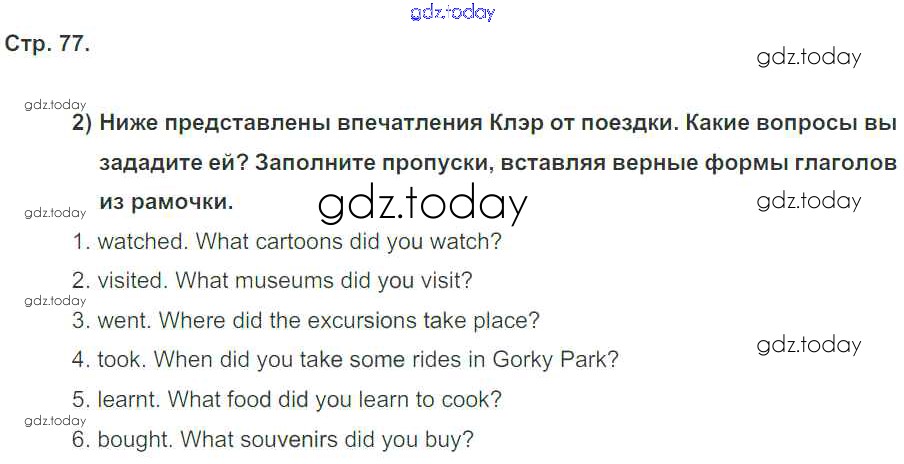 На страницах сайта gdz.today вы найдете учебный и вспомогательный материал, направленный на улучшения знаний школьной программы. ГДЗ - онлайн мир знаний Решение к Unit 6. We've had a nice trip to England стр. 77 Рабочей тетради по Английскому языку для 5 класса Кузовлев, Лапа Просвещение Академический школьный учебник 2013