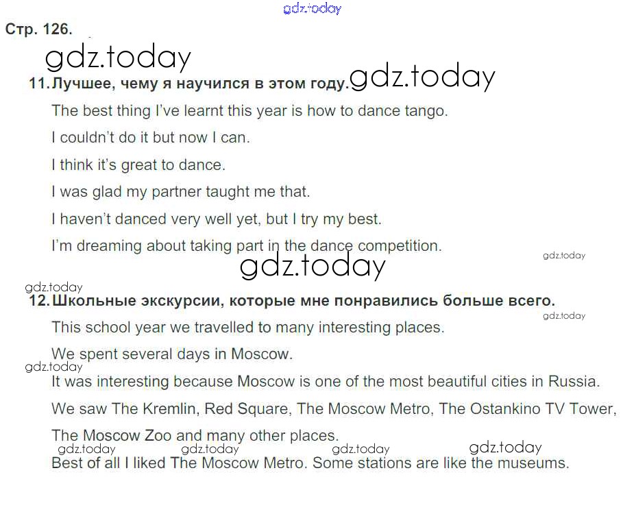 На страницах сайта gdz.today вы найдете учебный и вспомогательный материал, направленный на улучшения знаний школьной программы. ГДЗ - онлайн мир знаний Решение к Unit 8. My best impressions стр. 126 Рабочей тетради по Английскому языку для 5 класса Кузовлев, Лапа Просвещение Академический школьный учебник 2013