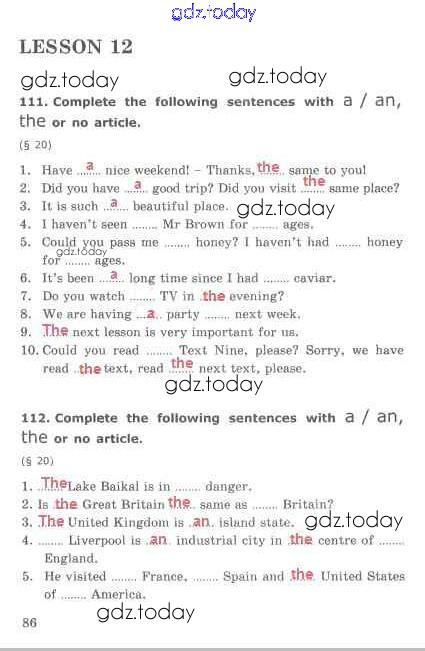 На страницах сайта gdz.today вы найдете учебный и вспомогательный материал, направленный на улучшения знаний школьной программы. ГДЗ - онлайн мир знаний Lesson 12 Решение к части 1 стр. 86 Сборнику упражнений по Английскому языку для 5 класса Барашкова Экзамен УМК 2020