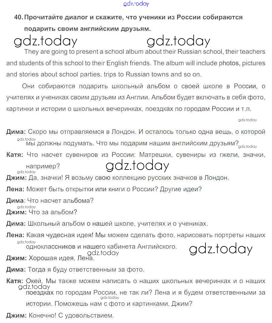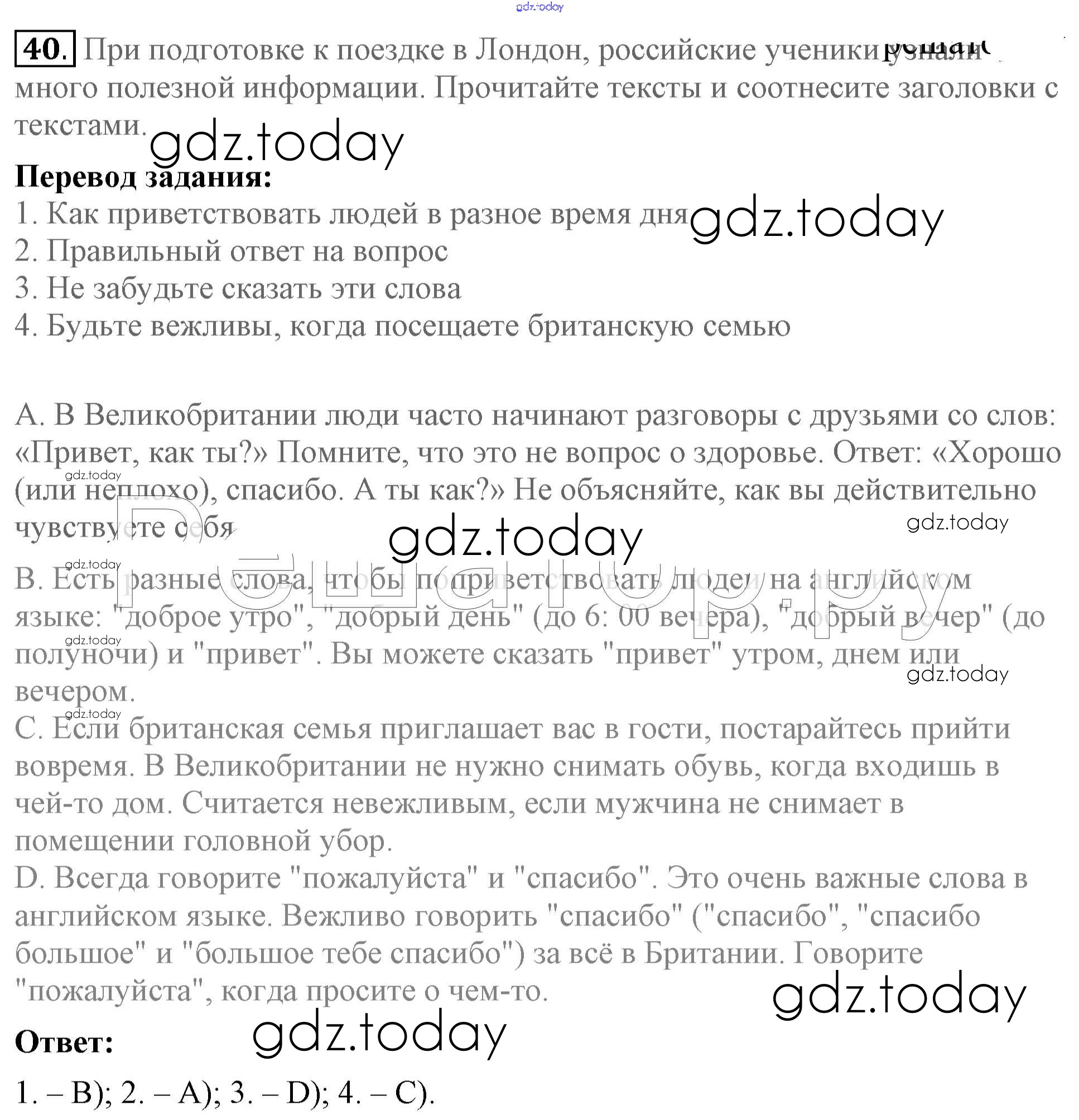 На страницах сайта gdz.today вы найдете учебный и вспомогательный материал, направленный на улучшения знаний школьной программы. ГДЗ - онлайн мир знаний Решение к Unit 2. We are going to travel to London 40 Учебнику по Английскому языку для 5 класса Биболетова, Денисенко Титул Enjoy English 2015