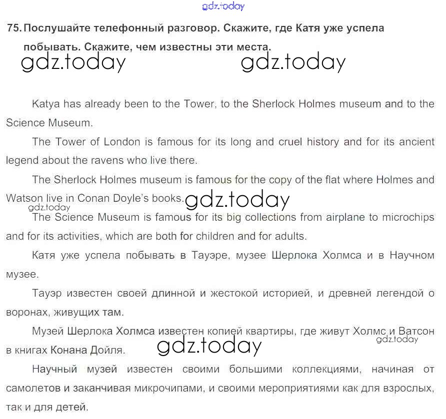 На страницах сайта gdz.today вы найдете учебный и вспомогательный материал, направленный на улучшения знаний школьной программы. ГДЗ - онлайн мир знаний Решение к Unit 3. Faces of London 75 Учебнику по Английскому языку для 5 класса Биболетова, Денисенко Титул Enjoy English 2015