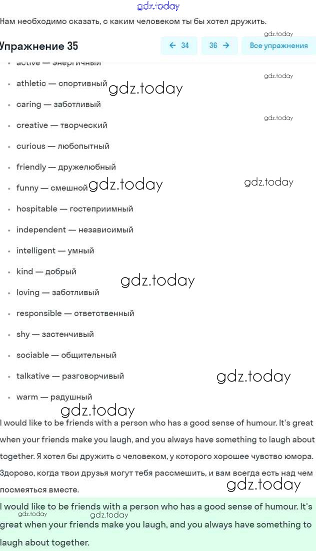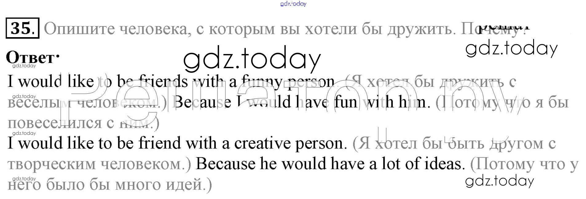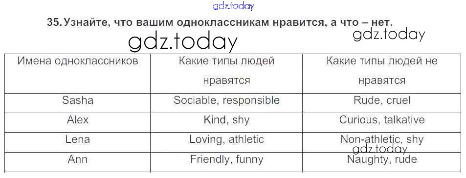 На страницах сайта gdz.today вы найдете учебный и вспомогательный материал, направленный на улучшения знаний школьной программы. ГДЗ - онлайн мир знаний Решение к Unit 4. Learning more about each other 35 Учебнику по Английскому языку для 5 класса Биболетова, Денисенко Титул Enjoy English 2015