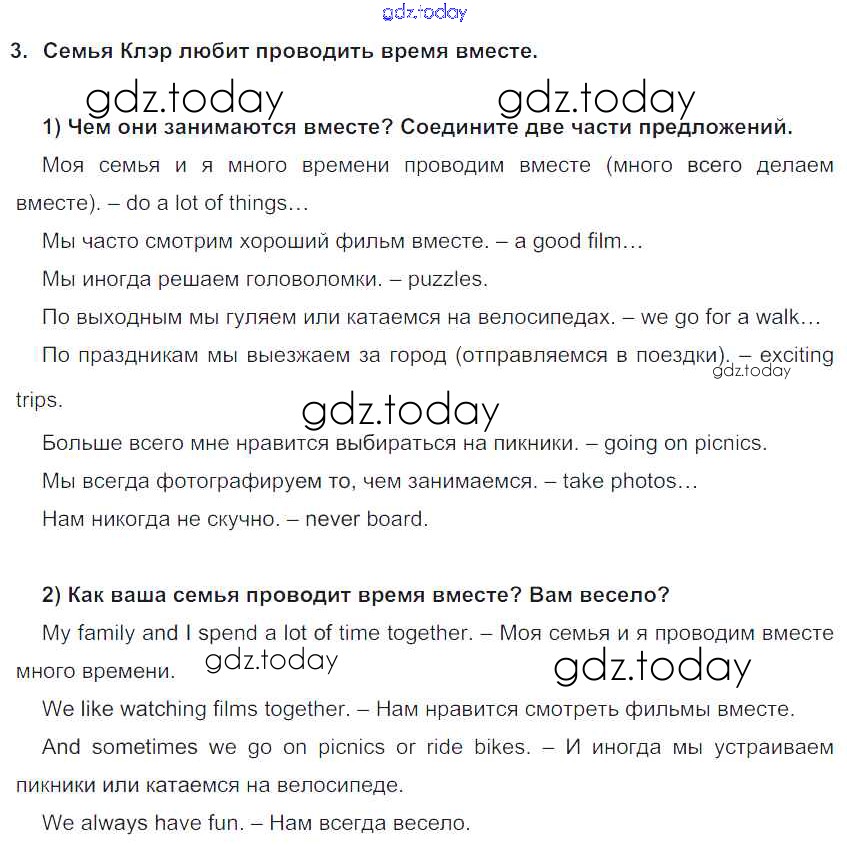 На страницах сайта gdz.today вы найдете учебный и вспомогательный материал, направленный на улучшения знаний школьной программы. ГДЗ - онлайн мир знаний Lesson 2. What do you do in your spare time? Решение к Unit 1. Let's make friends! 3 Учебнику по Английскому языку для 5 класса Кузовлев, Лапа Просвещение УМК 2015