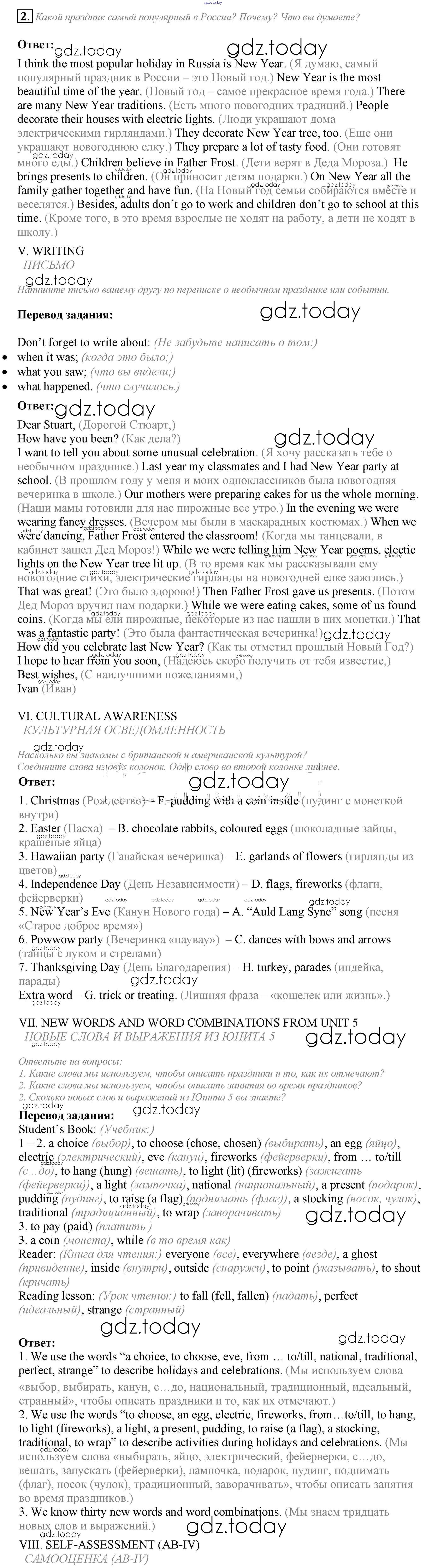 Ответы к Lesson 7-8. Test yourself Решение к Unit 5. My favourite celebrations 2 Учебнику по Английскому языку для 5 класса Кузовлев, Лапа Просвещение УМК 2015