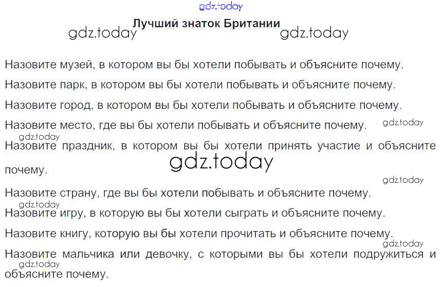 На страницах сайта gdz.today вы найдете учебный и вспомогательный материал, направленный на улучшения знаний школьной программы. ГДЗ - онлайн мир знаний Lesson 6. Brain of Britain Решение к Unit 8. My best impressions 1 Учебнику по Английскому языку для 5 класса Кузовлев, Лапа Просвещение УМК 2015