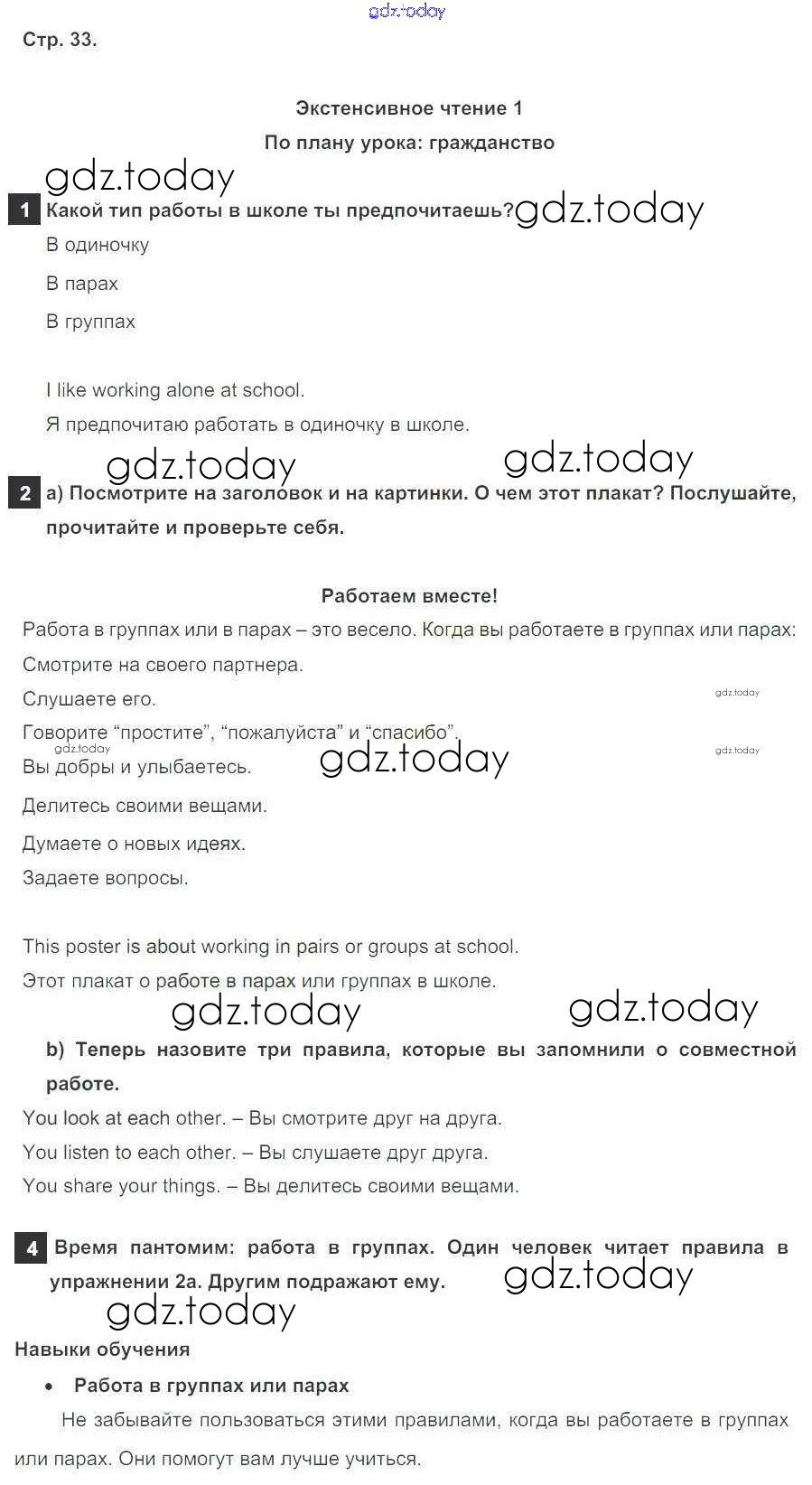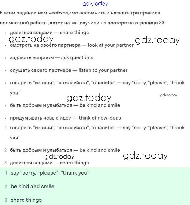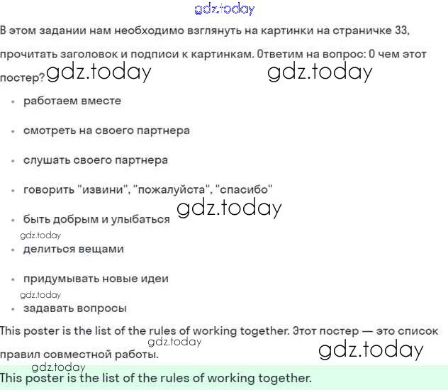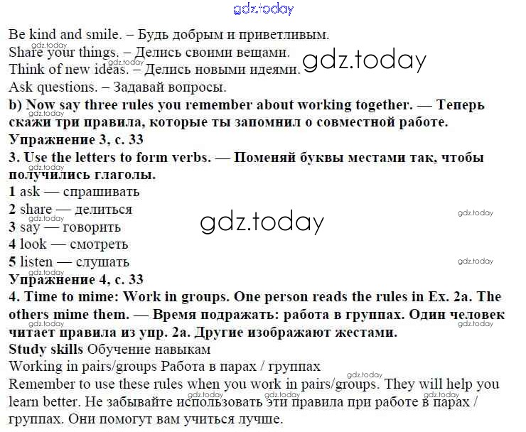На страницах сайта gdz.today вы найдете учебный и вспомогательный материал, направленный на улучшения знаний школьной программы. ГДЗ - онлайн мир знаний Решение к Module 1. School days стр. 33 Учебнику по Английскому языку для 5 класса Ваулина, Дули Просвещение Spotlight 2015