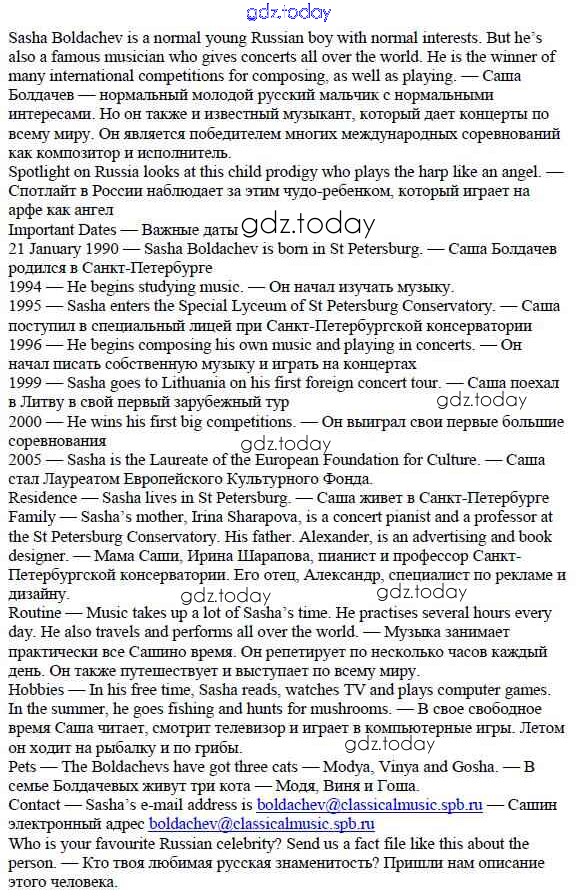 На страницах сайта gdz.today вы найдете учебный и вспомогательный материал, направленный на улучшения знаний школьной программы. ГДЗ - онлайн мир знаний Решение к Spotlight on Russia стр. 7 Учебнику по Английскому языку для 5 класса Ваулина, Дули Просвещение Spotlight 2015