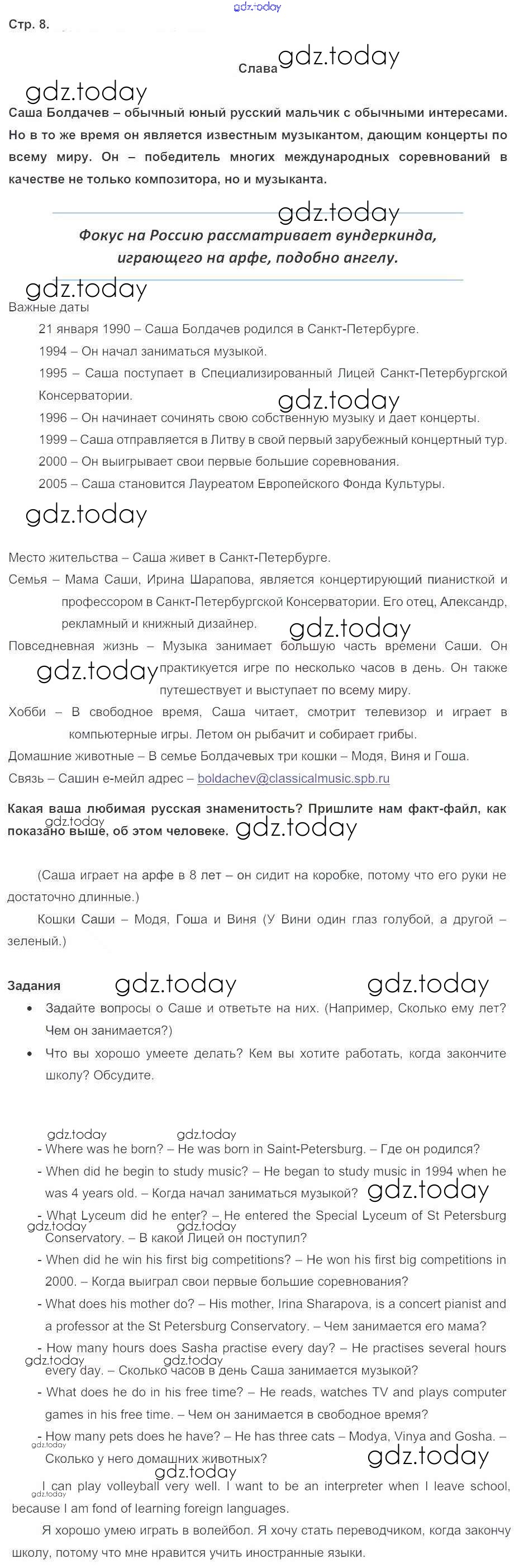 На страницах сайта gdz.today вы найдете учебный и вспомогательный материал, направленный на улучшения знаний школьной программы. ГДЗ - онлайн мир знаний Решение к Spotlight on Russia стр. 8 Учебнику по Английскому языку для 5 класса Ваулина, Дули Просвещение Spotlight 2015