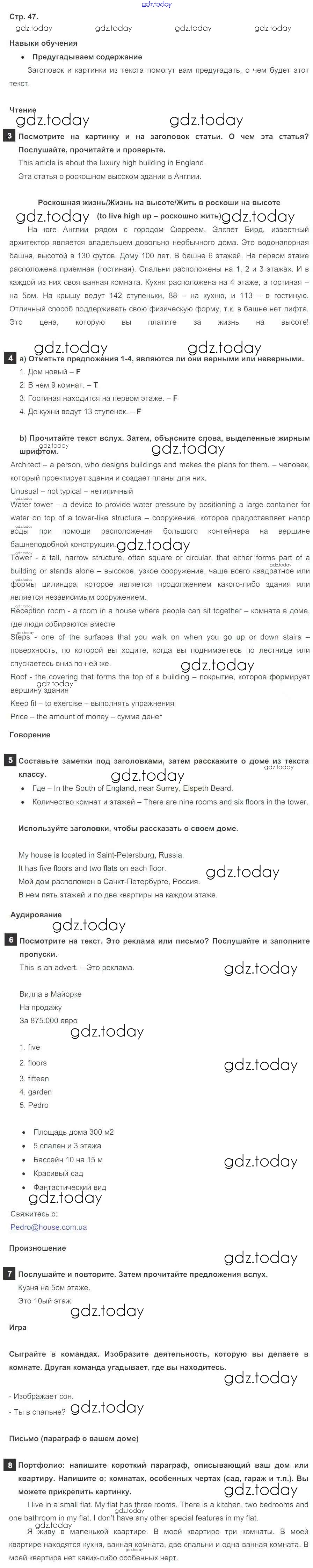 На страницах сайта gdz.today вы найдете учебный и вспомогательный материал, направленный на улучшения знаний школьной программы. ГДЗ - онлайн мир знаний Решение к Module 3. My home, my castle стр. 47 Учебнику по Английскому языку для 5 класса Ваулина, Дули Просвещение Spotlight 2015