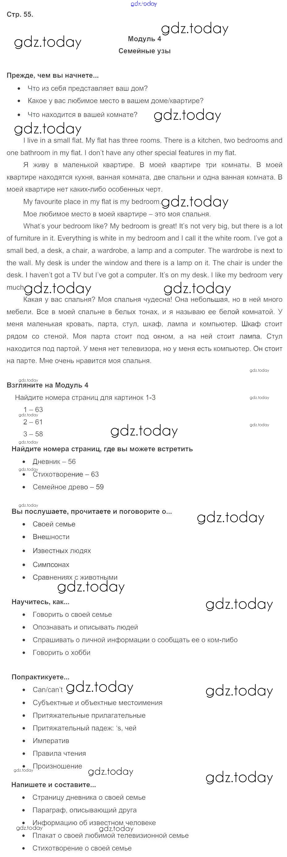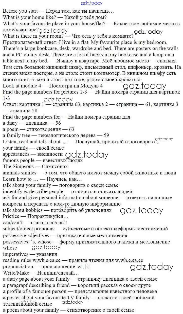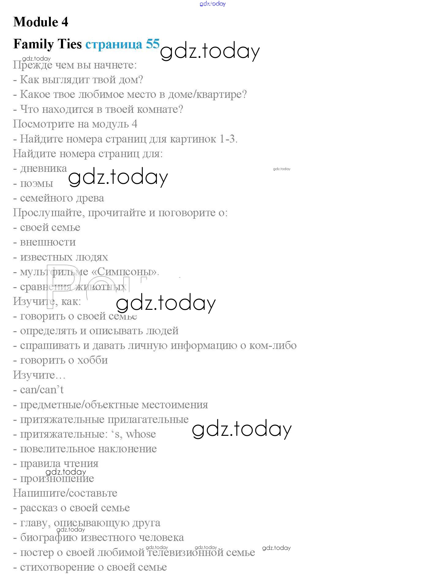 На страницах сайта gdz.today вы найдете учебный и вспомогательный материал, направленный на улучшения знаний школьной программы. ГДЗ - онлайн мир знаний Решение к Module 4. Family ties стр. 55 Учебнику по Английскому языку для 5 класса Ваулина, Дули Просвещение Spotlight 2015