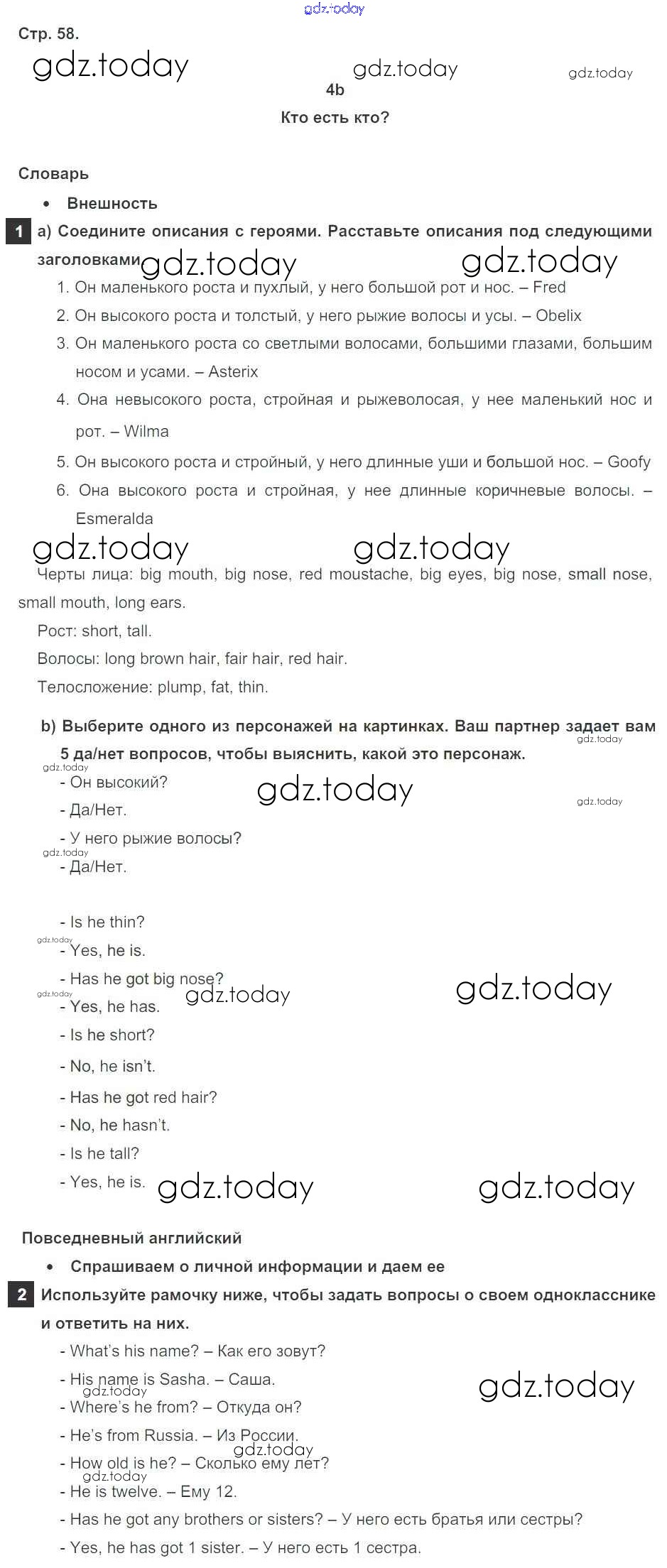 На страницах сайта gdz.today вы найдете учебный и вспомогательный материал, направленный на улучшения знаний школьной программы. ГДЗ - онлайн мир знаний Решение к Module 4. Family ties стр. 58 Учебнику по Английскому языку для 5 класса Ваулина, Дули Просвещение Spotlight 2015